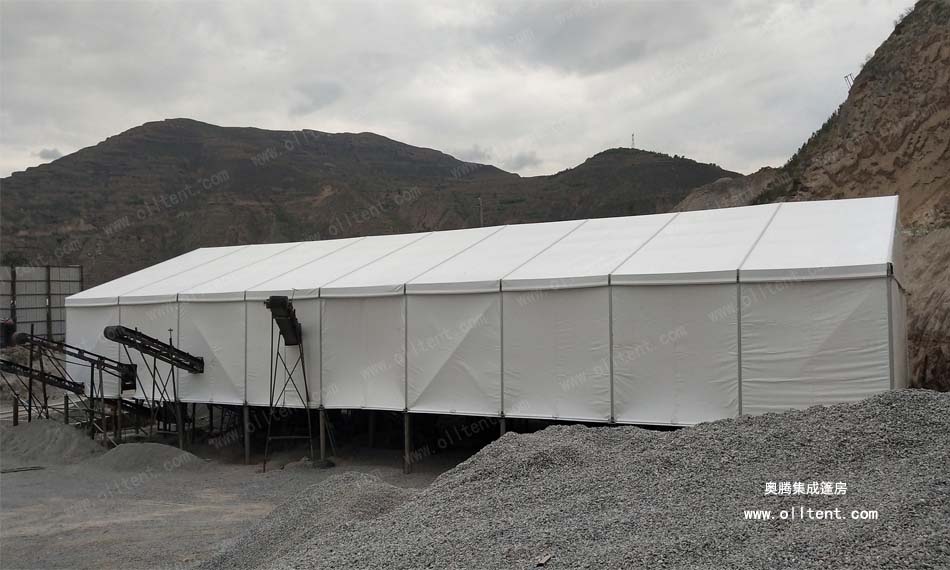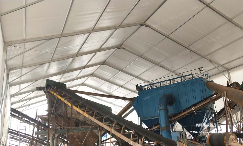 后來老板介紹道:“這是江蘇一家工廠研發出一種裝配式的廠房,跨度可達80米、長度無限延伸、高度10多米,能抗風載雪,材料也是高度符合環保要求。 如果不蓋棚子,這個灰到處飄,二十米內全都是灰,路上草上樹上地上,到處都是。長年累月積累下來的灰,相當驚人的。這樣做就把大部分灰留在了廠區不至于飄灑的哪里都是。像我做這個石料行業的,開采地點會時常變更,堆積物料的卸貨點也會變更,這就要一個遮蔽物隨著工作地點的變化而變化。而我現在使用的這種裝配式篷房就能輕松實現,裝配式篷房就可以隨意搭拆,如果框架加上輪轂就可以實現篷房哪里需要哪里“走”。而且咱們也要積極樹立綠色治理理念,轉變思維,創新發展,為進一步提升全市的生態環境治理和空氣質量提升做出更大貢獻看來這位老板不僅會做生意,也非常有“覺悟”的!