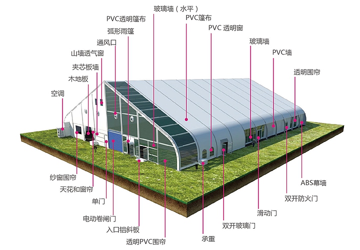 桃形篷房有多種可供選項購的配置,其功能和用途更為強大。例如:ABS墻體、三明治墻體、彩鋼瓦墻體、玻璃幕墻、透明頂、頂幔布幔內飾、排風扇、卷簾門、玻璃門、承重盤承重框、地板系統、排水槽等