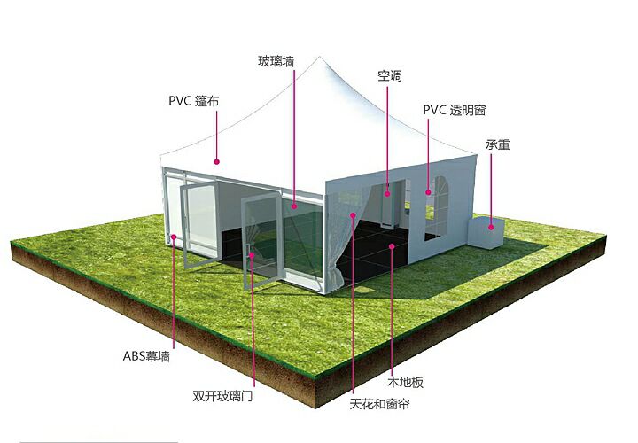 尖頂篷房優雅,堅固,潮流,搭建工期短,易于組裝和拆卸。新錐頂篷固定方式,已獲得設計專利證書,新的固定方式,不但大大減少了組裝時間,很好的防止滑出。無需大型機械協助,單個也可用排水槽連接起來組成更大的面積,形成特殊的造型。