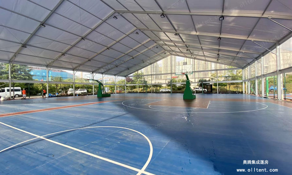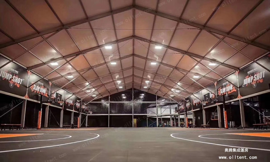 奧騰篷房可以打造各式各樣的籃球場館篷房,跨度從3米至60米,高度從3米到8米,在籃球場館篷房設計外觀上更是多樣化:球形、人字形、弧形等。完全滿足網球、足球、羽毛球、游泳等體育活動對場館的需求。