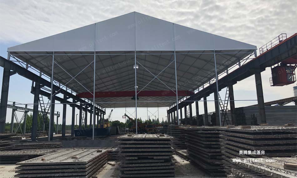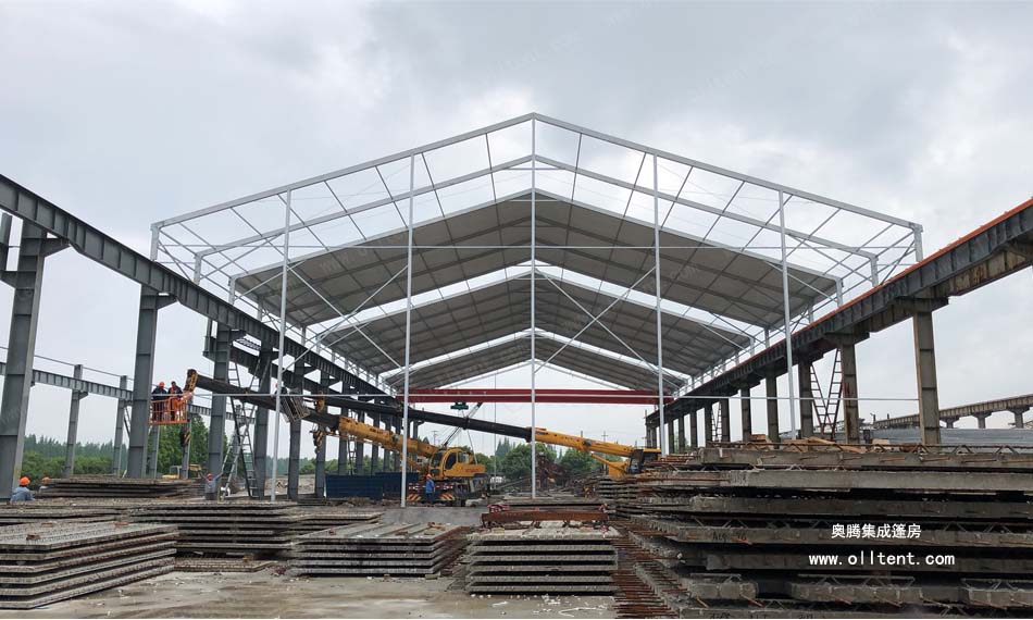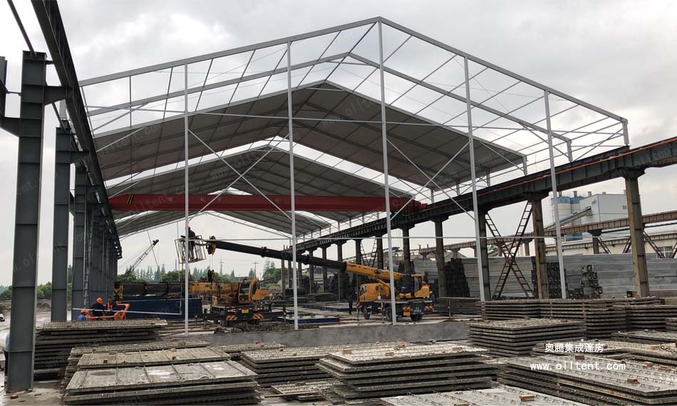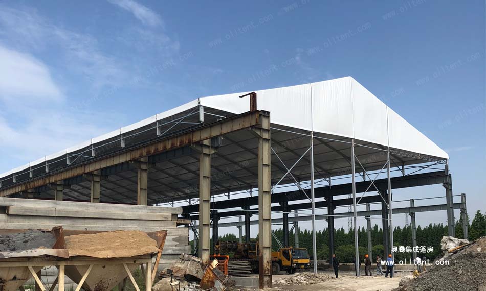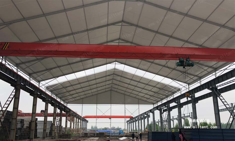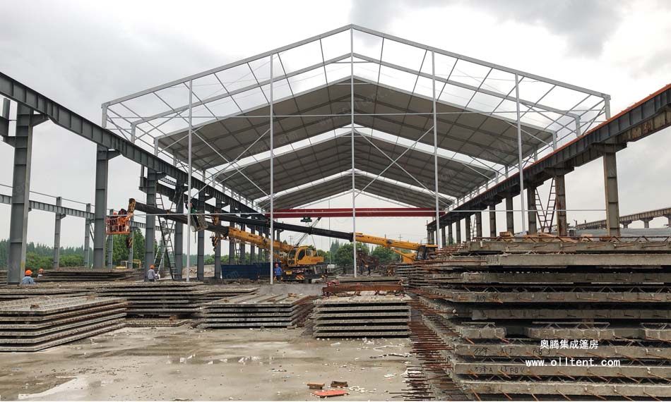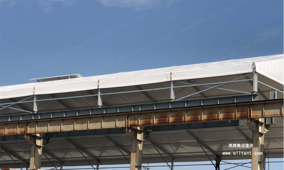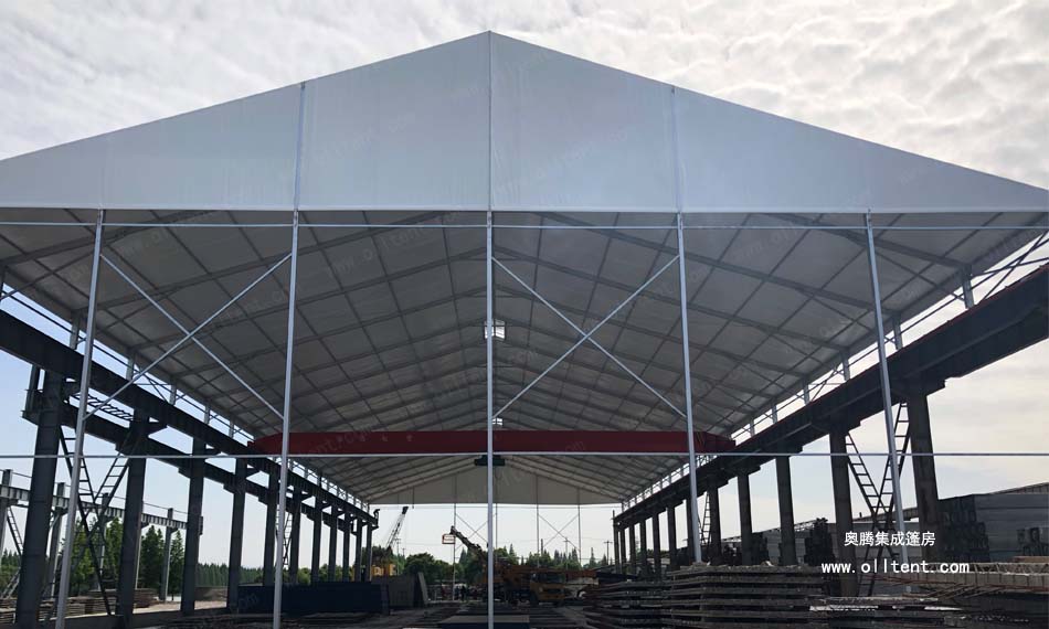 常熟賽順奇工業(yè)車間篷房搭建面積為4000平方米,施工時(shí)間是2018年3月,篷房規(guī)格為31米寬,130米長,邊高達(dá)到14米,搭建難度較高。篷房框架結(jié)構(gòu)采用工字鋼和鋁合金型材相結(jié)合,篷布采用850g/m2PVC涂層布,兩面白色。篷房內(nèi)部安裝行車,頂部開啟透氣窗,可以在篷房內(nèi)部進(jìn)行設(shè)備的裝卸作業(yè)。